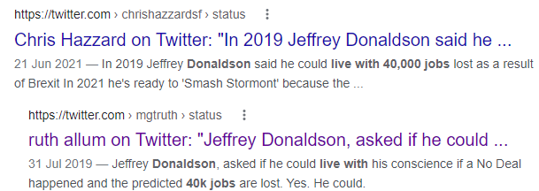 Local DUP Brexiter, Sir Jeffrey Donaldson, agrees. Even in a small region of 1.5 million people, as far as Jeffrey is concerned, the loss of 40,000 jobs (40,000!) would be a price worth paying, in the greater interest of the Brexiters’ all-important “constitutional purity”, i.e., having the hardest possible break from the EU. It might fuck up the economy, but just think of how constitutionally pure you would be! 40,000 job losses? No problem, Jeffrey could “live with that“: