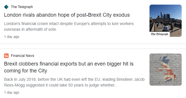 This is how Brexiters roll btw – prior to Brexit, they boasted in advance about how wonderful Brexit assuredly would be. Now that it’s not looking so great, in classic damning with faint praise manner, they still brag about it “not being as bad as the Remainers predicted“. In that manner, the Daily Telegraph crows that there hasn’t been a mass exodus from London’s financial district, the “Square Mile“, aka “The City“; and, comically, in the same set of Google search results, another newspaper carries a report on how badly the City already is being affected by Brexit: