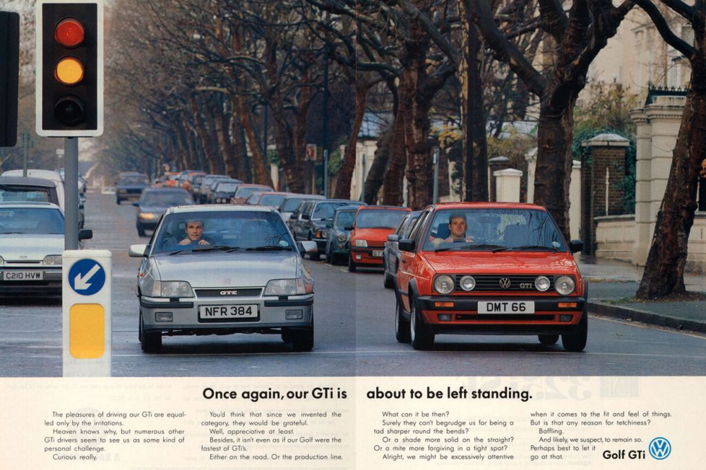 And the magazine ad below (featuring a Vauxhall wanker in the grey car, shoulder chips firmly in place) also is very true to life. In those days, the VW GTi badge was an aggression magnet: